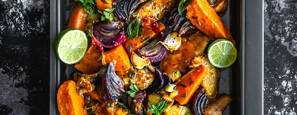 Remove the chicken from the oven after 10 minutes and add the sweet potatoes and red onions.
